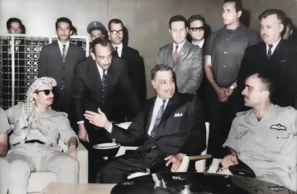 EGIPSKI PREZYDENT Gamal Abdel Nasser pośredniczy w zawieszeniu broni między Jaserem Arafatem a królem Jordanii Husajnem podczas nadzwyczajnego szczytu Ligi Arabskiej w Kairze 27 września 1970 r. Nasser zmarł następnego dnia na zawał serca. (źródło: VIA WIKIMEDIA COMMONS)